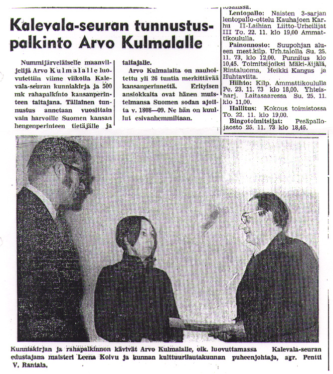 perinnetiedon kertojana. Myös Kalevala seura muisti Arvoa, Suomen kansan